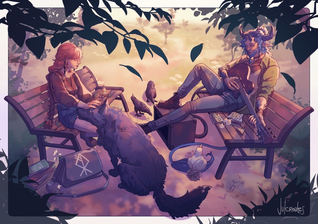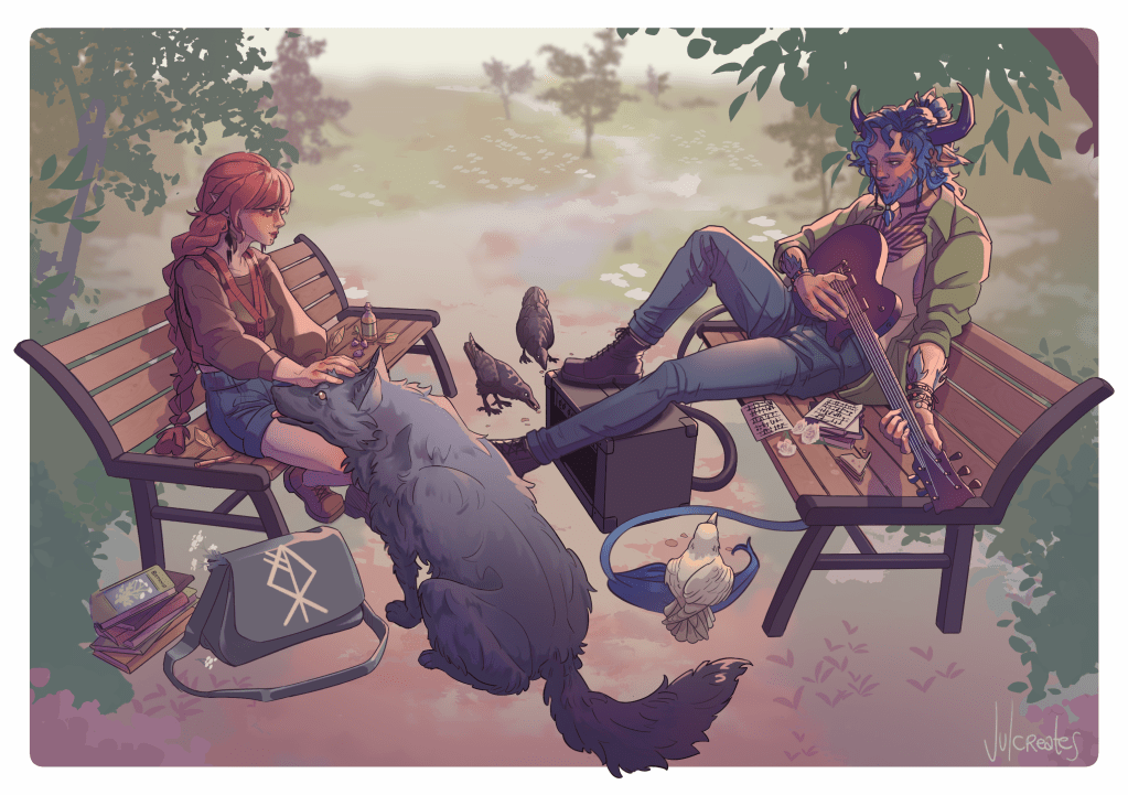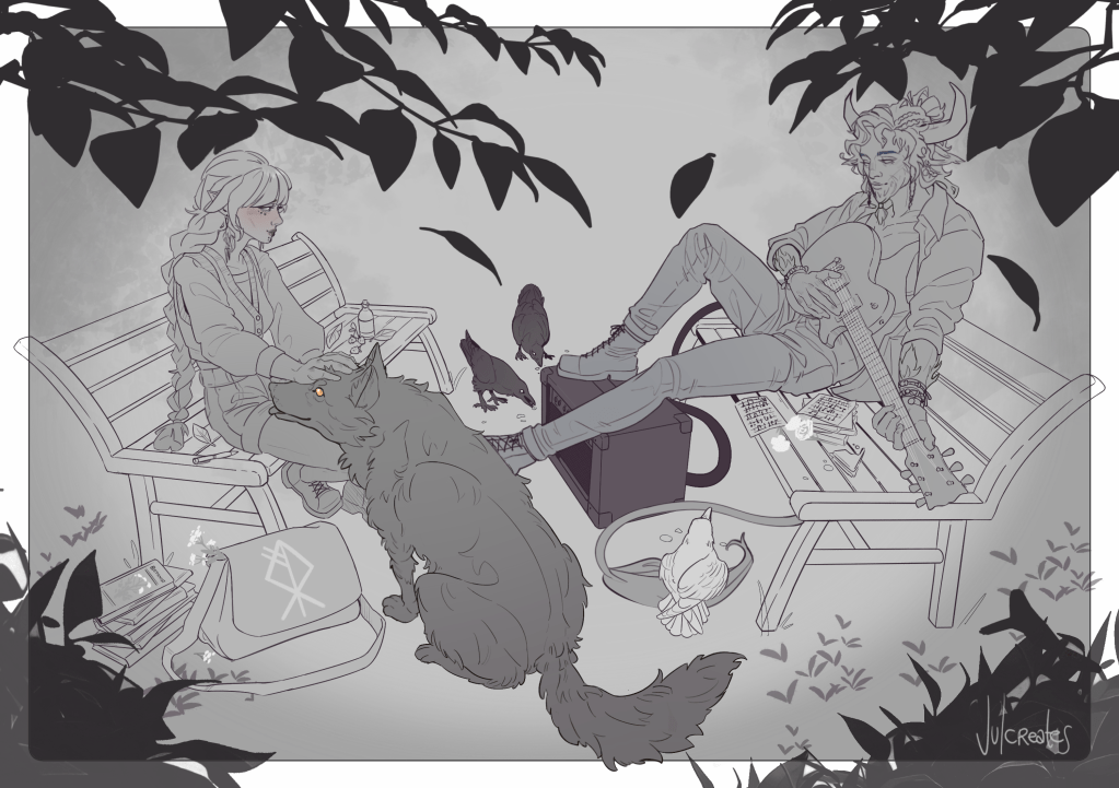 Top Left: Sketch/3D base; Bottom Left: Line Art; Right: 1st colour pass plus background w/o the final lighting