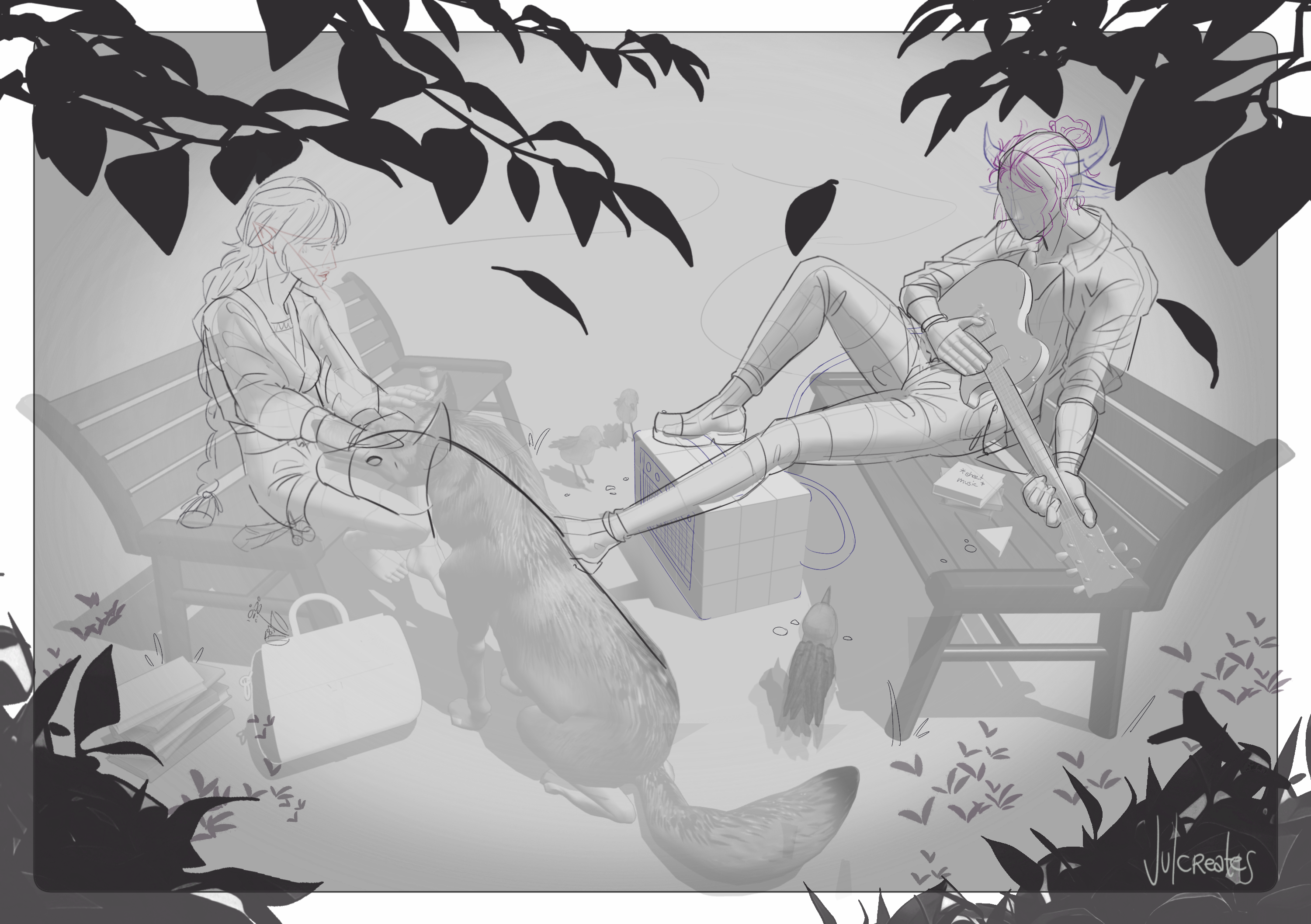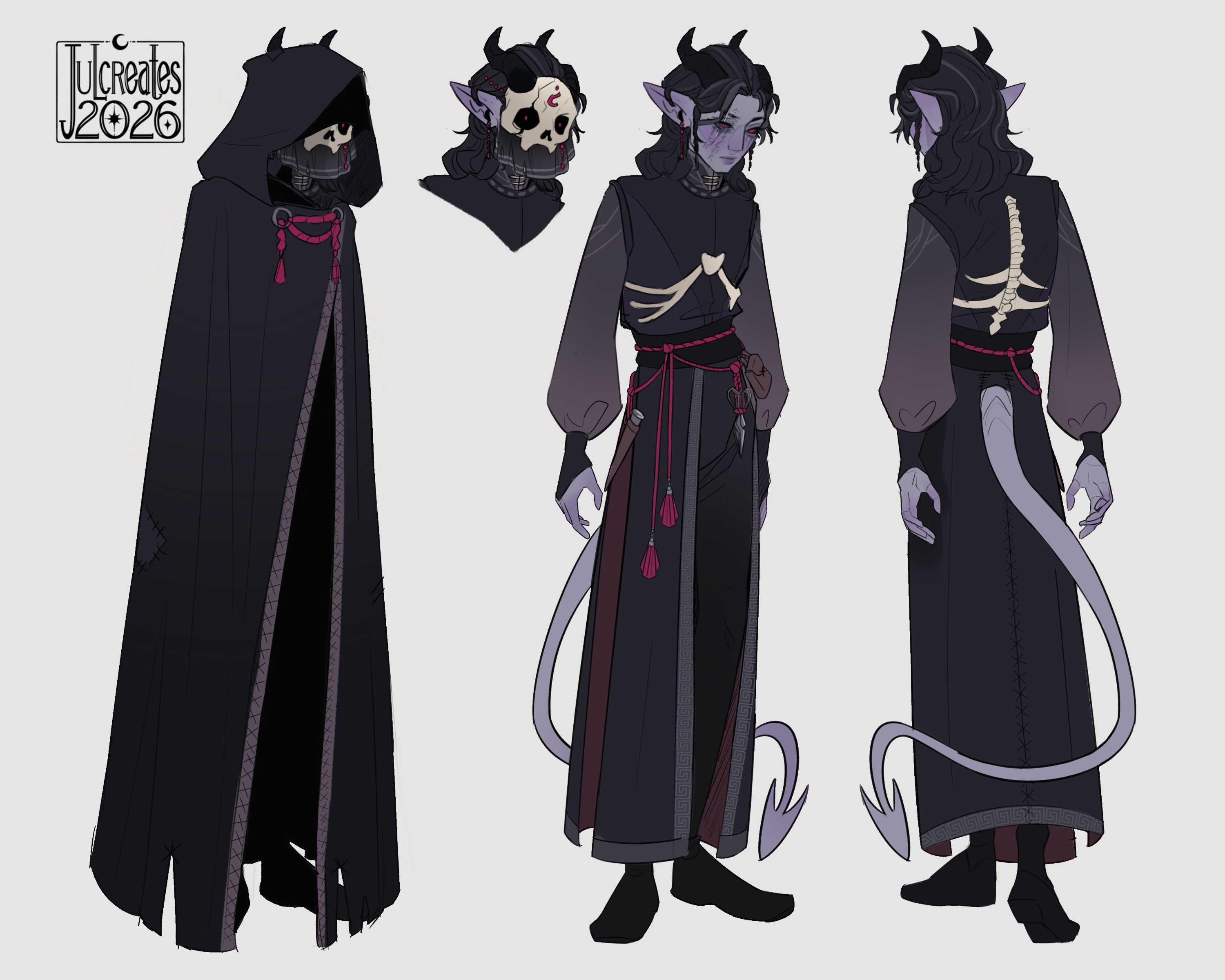 Top Left: Original Sketch Idea; Bottom Left: Refined Sketch; Middle Top: Line Art Character; Middle Bottom: Detailing, Finished Line Art, Values; Right: Monochrome Rendering plus detailing