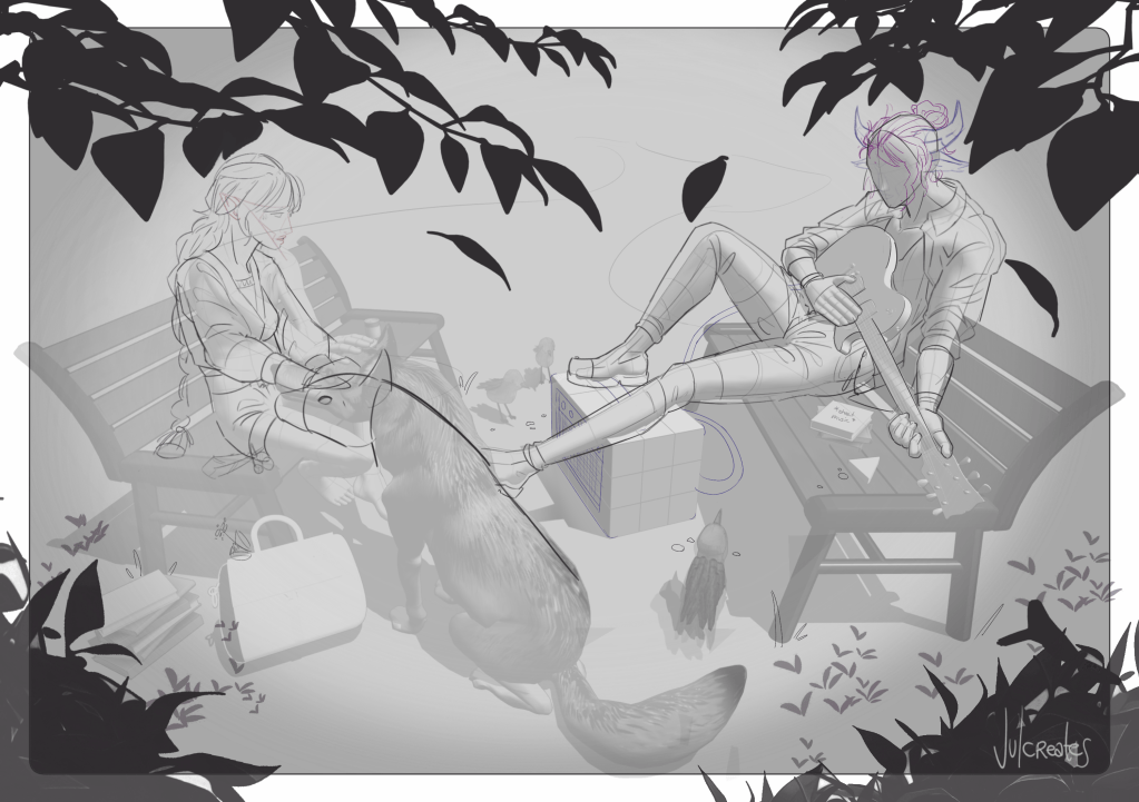 Left: Finished Piece; Middle Top: Original Sketch; Middle Bottom: Refined Lines; Right: Colour pass with detailing